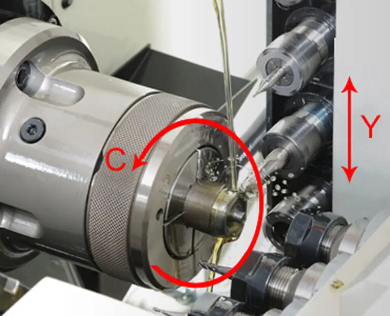 Ось Y в сочетании с фрезерным силовым шпинделем и функцией оси C позволяет выполнять операции бокового фрезерования, сверления и нарезания резьбы, что делает ее особенно подходящей для высокоэффективной обработки небольших сложных деталей.